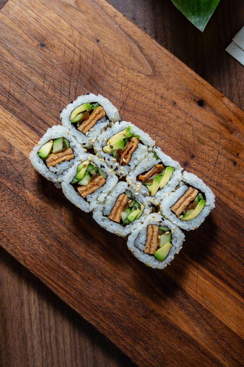 Fritert aspargus / søtpotet, Advocado, vårløk, kanpyo, Agurk, Eple, Jordbær er blandt råvarene vi velger i når vi lager veganske alternativer.