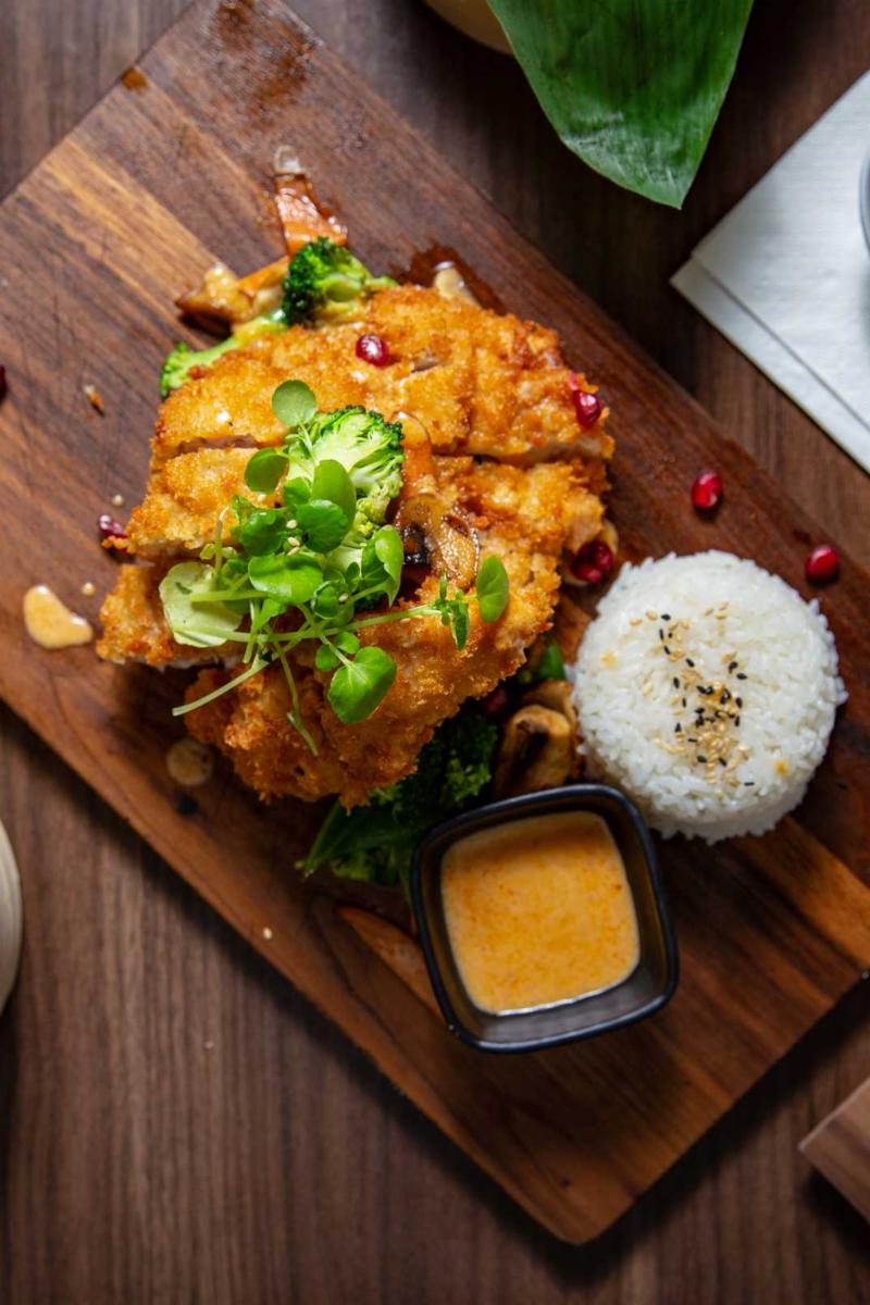 Gårdskylling pannert og frityrstekt gårdskylling med grønnsaker og ris. Serveres med currysays