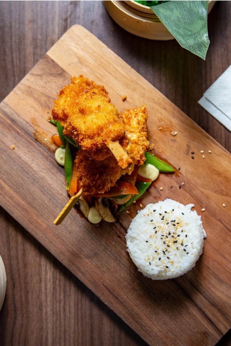 2 stk friterte kyllingspyd med salat og ris.Kyllingspyd pannert og fritert i hvetemel, serveres med mangosalat og ris.Passer som siderett til sushi eller som en barnemeny til de minste!